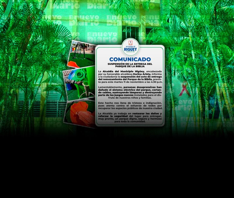 EL NUEVO DIARIO, LA ALTAGRACIA. – La Alcaldía del Municipio Higüey encabezada por alcaldesa Karina Aristy informó la suspensión del acto de entrega del remozamiento del Parque de la Biblia, que estaba programado para este martes 11 de noviembre a las 4:30 p. m.