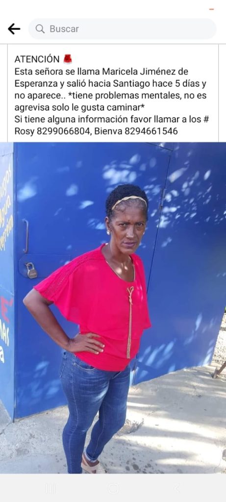 La encontraron chocada y golpeada. La dama padecía achaques mentales y salió de su casa, en Esperanza de Valverde, hacia Santiago. Caminando se fue, deambulando anduvo bastante. La familia estaba ya preocupada.