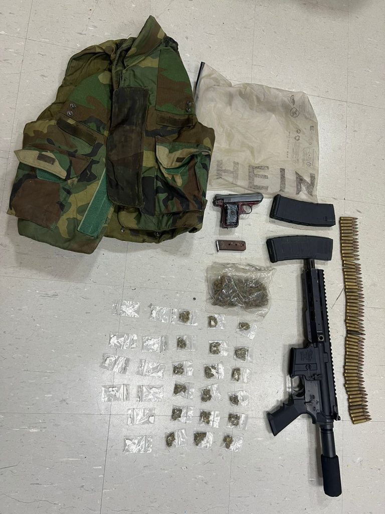 Tras detener el vehículo y realizar la requisa protocolar, se le ocuparon un fusil Hebron, KYAM-15, multicalibre, No. 20377394, dos cargadores para el mismo, 59 cápsulas, un chaleco antibalas camuflado, una pistola, 28 porciones de sustancias narcóticas, 10 de presunto crack, 18 de presunta marihuana y una porción grande del mismo tipo.