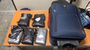 Las autoridades indicaron que mientras realizaban labores de supervisión en el área de aduanas, unidades caninas alertaron de sustancias extrañas en uno de los equipajes.