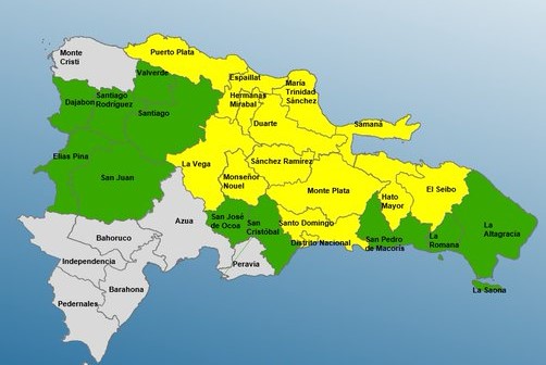 La institución señaló que en alerta amarilla está el Distrito Nacional, Santo Domingo, Sánchez Ramírez, María Trinidad Sánchez, La Vega, Hermanas Mirabal, Monseñor Nouel, Monte Plata, Hato Mayor, Samaná, Duarte, Espaillat y El Seibo.