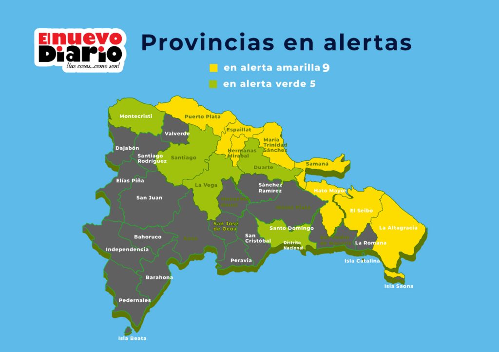 En alerta amarilla están Puerto Plata, María Trinidad Sánchez, Espaillat, Hato Mayor, El Seibo, Samaná, Duart, Hermanas Mirabal y La Altagracia
