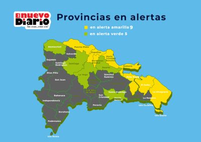 EL NUEVO DIARIO, SANTO DOMINGO. – El Centro de Operaciones de Emergencias (COE) aumentó este jueves a nueve las provincias en amarillo y mantuvo a otras cuatro y al Distrito Nacional en verde, ante la previsión esta tarde de aguaceros de moderados a fuertes, tormentas eléctricas y ráfagas de viento por la incidencia de una vaguada.