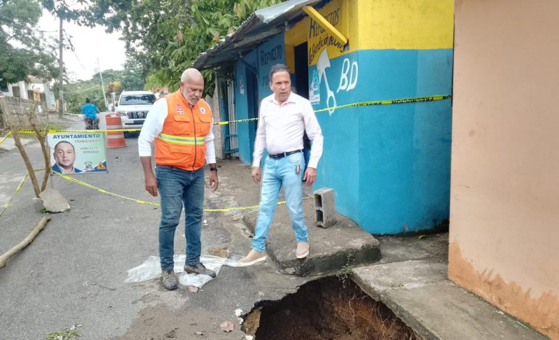 EL NUEVO DIARIO, PERALVILLO, MONTE PLTA.– El diputado Román de Jesús junto al director provincial de la Defensa Civil, Miguel Ángel Andújar, realizaron la supervisión de una alcantarilla que colapsó la noche de ayer como consecuencia de las intensas lluvias provocadas por la tormenta tropical Melissa, en la comunidad La Recta, en el municipio Peralvillo.
