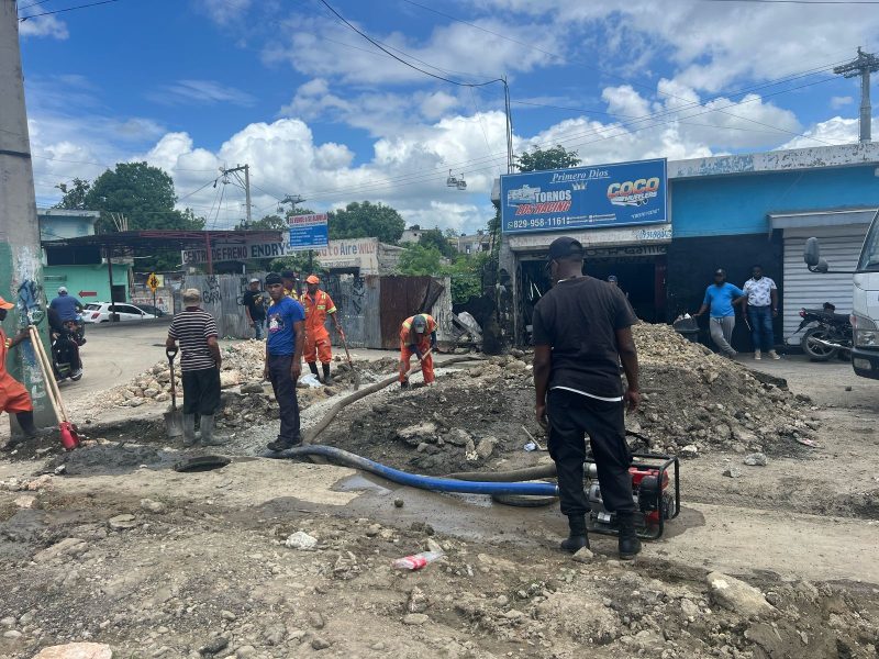 Una de las intervenciones se está realizando en las inmediaciones de la calle de Los Santos, donde brigadas trabajan arduamente para corregir una falla estructural que había deteriorado considerablemente la vía, mientras que otro equipo labora próximo a Pollo Cibao.