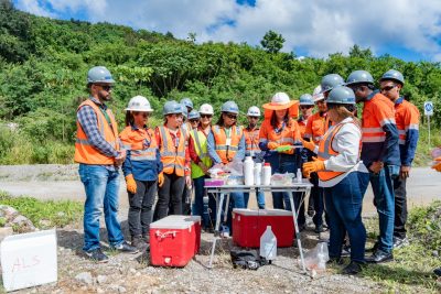 Durante la jornada 52 del monitoreo ambiental, los participantes fueron recibidos por un equipo de técnicos del Departamento de Medio Ambiente de Pueblo Viejo, quienes junto a un equipo de INTEC, realizaron una breve capacitación acerca del proceso completo antes de salir al campo a realizar los muestreos de los efluentes que salen de la planta de tratamiento de agua, agua de los ríos que pasan cerca de la mina, el aire y el ruido.