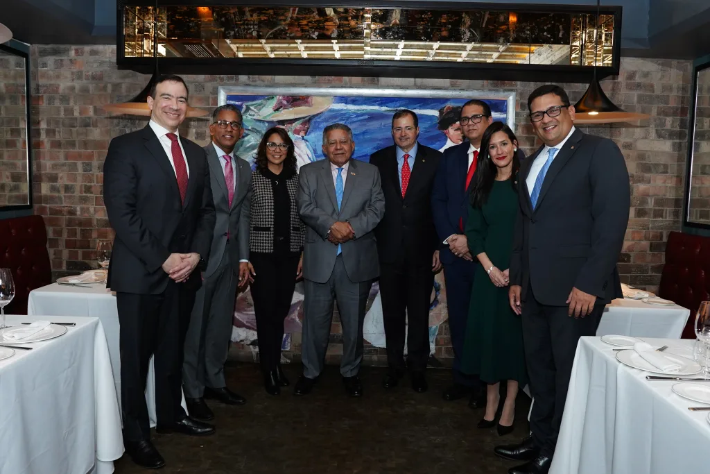 Steven Puig, presidente del Banco BHD, entregó una placa a Bolívar Díaz durante un almuerzo privado con los equipos de la entidad financiera y el personal de la embajada, en el marco de la Feria Internacional de Turismo (FITUR 2024).