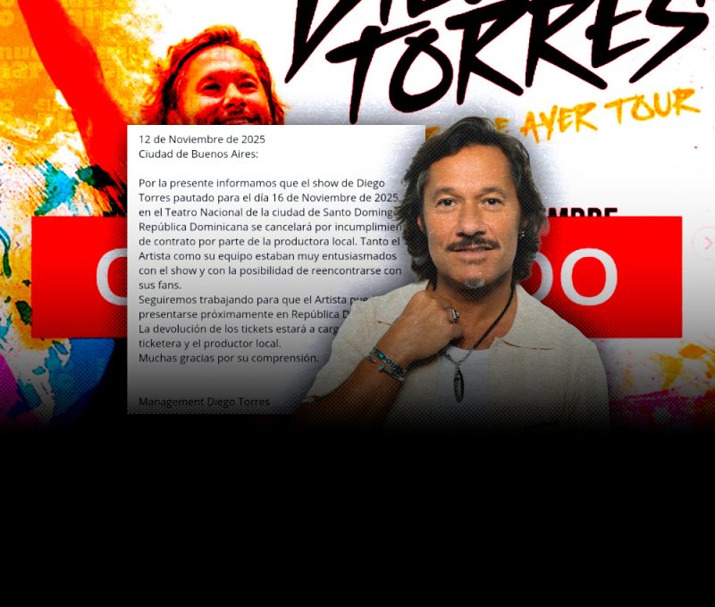 EL NUEVO DIARIO, SANTO DOMINGO. – El concierto del artista argentino Diego Torres, programado para celebrarse el sábado 16 de noviembre en la Sala Principal Carlos Piantini del Teatro Nacional Eduardo Brito fue oficialmente cancelado, según informaron este miércoles tanto la productora local BigStarSD como el management del artista, aunque con explicaciones distintas sobre los motivos.
