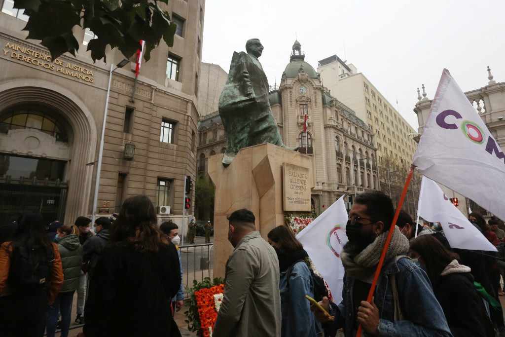 Luego de marchar por calles aledañas al Palacio de La Moneda, los manifestantes depositaron ofrendas florales en la puerta de la sede del Gobierno, lugar por donde fue sacado el cuerpo del exmandatario Salvador Allende una vez consumado el asalto militar el 11 de septiembre de 1973.