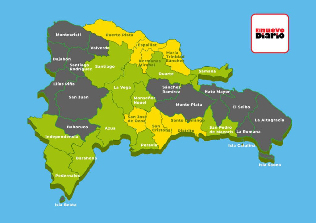 En alerta verde se encuentran: Santiago, Monseñor Nouel, La Vega, Azua, Barahona, San Pedro de Macorís, Duarte, Samaná, Peravia, Perdernales, e Independencia.