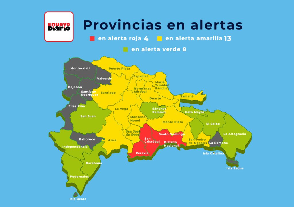 Mientras que en alerta verde se encuentran: Sánchez Ramírez, La Altagracia, Hato Mayor, Barahona, Independencia, Pedernales y El Seibo, por posibles crecidas de ríos, arroyos y cañadas, así como inundaciones repentinas o urbanas.