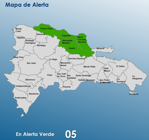 En ese sentido, se encuentran en alerta: Espaillat, Duarte, María Trinidad Sánchez, Hermanas Mirabal y Puerto Plata.