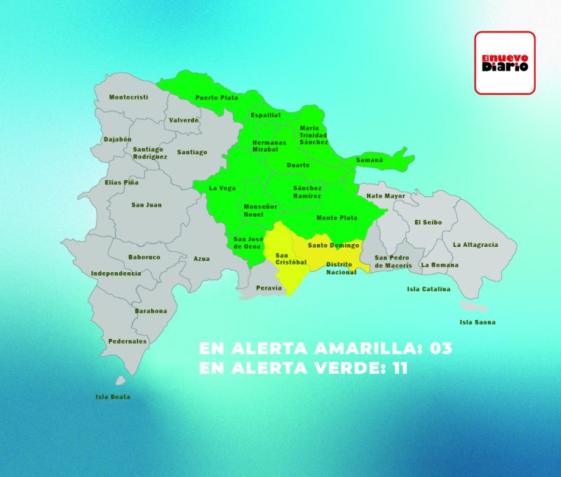 Mientras que en alerta verde se encuentran Monseñor Nouel, Monte Plata, Samaná, Hermanas Mirabal, María Trinidad Sánchez, Duarte, San José de Ocoa, La Vega, Sánchez Ramírez, Espaillat y Puerto Plata.
