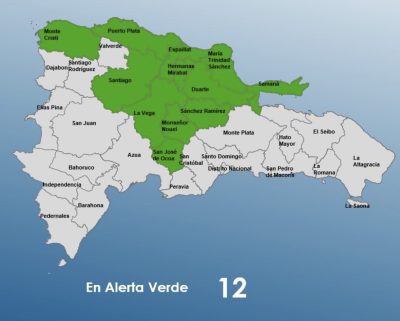 EL NUEVO DIARIO, SANTO DOMINGO.- El Centro de Operaciones de Emergencias (COE) aumentó este miércoles a 12 las provincias en alerta verde, ante las condiciones meteorológicas adversas que podrían generar aguaceros moderados a fuertes, tormentas eléctricas y ráfagas de viento en diferentes puntos del país.
