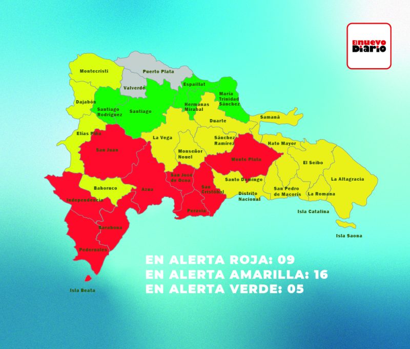Mientras que en alerta amarilla están La Vega, Samaná, Hato Mayor, El Seibo, La Romana, Elías Piña, Duarte, Bahoruco, Monseñor Nouel, Sánchez Ramírez, Monte Cristi, Santo Domingo, San Pedro de Macorís, Distrito Nacional, Dajabón, y La Altagracia.