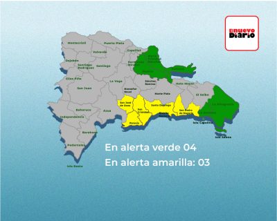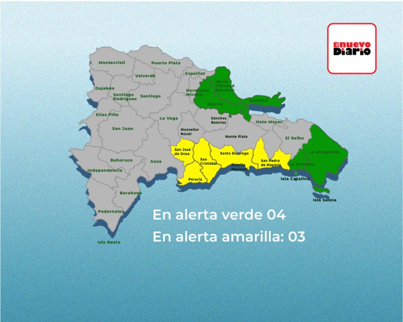 Se encuentran en alerta amarilla: San Cristóbal, San Pedro de Macorís, el Distrito Nacional y Santo Domingo. Continúan en verde: María Trinidad Sánchez, Samaná, Duarte, La Romana y La Altagracia.