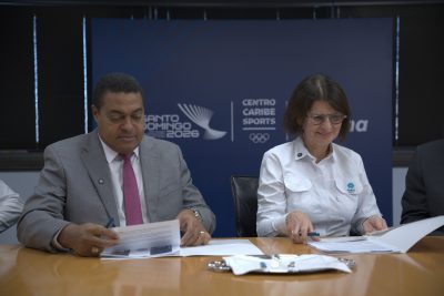 La firma estuvo encabezada por Mercedes Ramos, presidenta del Consejo de Directores del Grupo Ramos, así como por José P. Monegro, titular del Comité Organizador, y Luis Mejía, presidente de Centro Caribe Sports.
