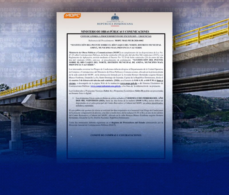 El proceso de licitación, identificado con el número MOPC-MAE-PEUR-2026-0002, permitirá avanzar de manera oportuna en la construcción de un nuevo puente, concebido bajo los estándares técnicos vigentes, con criterios de seguridad, durabilidad y resiliencia.