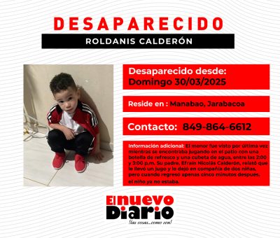 EL NUEVO DIARIO, MANABAO-JARABACOA.– Un niño de tres años, identificado como Roldanis Calderón, desapareció el domingo en Manabao, en las cercanías del Parque Nacional José Armando Bermúdez, en Jarabacoa.