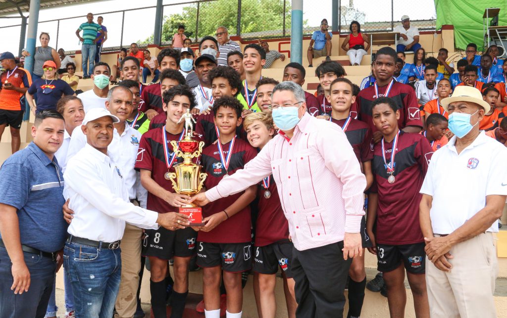 Pedro González ejecutivo de mercadeo de la Asociación Mocana, José Frank Acosta presidente de la Asociación de Fútbol de Espaillat (AFE), junto a los demás ejecutivos y el expresidente de la institución Nelson Peña, entregaron el trofeo de campeón al equipo del Distrito Nacional.