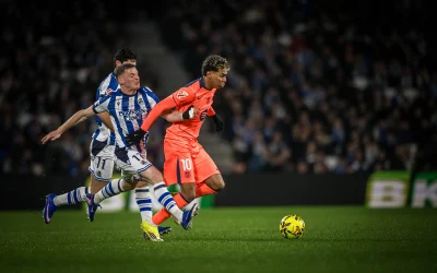 En el minuto 84 Koundé remató al travesaño y el balón no entró por escasos centímetros. A los dos minutos, la Real se quedó con 10 por una roja directa a Soler tras una entrada dura a Pedri. En el 92, Rashford tuvo el empate en un córner olímpico que desvió, nuevamente, la madera, y minutos después Remiro detuvo un lanzamiento lejano de Roony Bardghji.