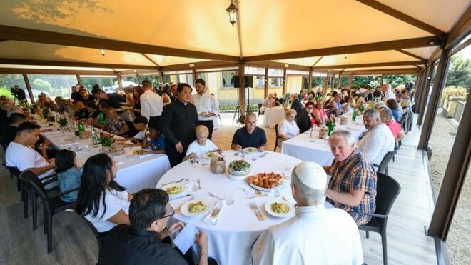 El papa se sentó en una mesa redonda acompañado de una mujer peruana Rosabal León, que vive en Italia desde hace cinco meses y llegó con su marido y dos hijos, también presentes en la comida, y Gabriella Oliveiro, de 85 años, una de las tantas ancianas y ancianos presentes en esta ocasión y que viven completamente solos.