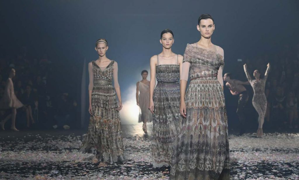 Los jardines se vieron en los bordados, especialmente cuidados, con flores reproducidas en tres dimensiones sobre los vestidos y estampados florales a base de lentejuelas en faldas y vestidos.