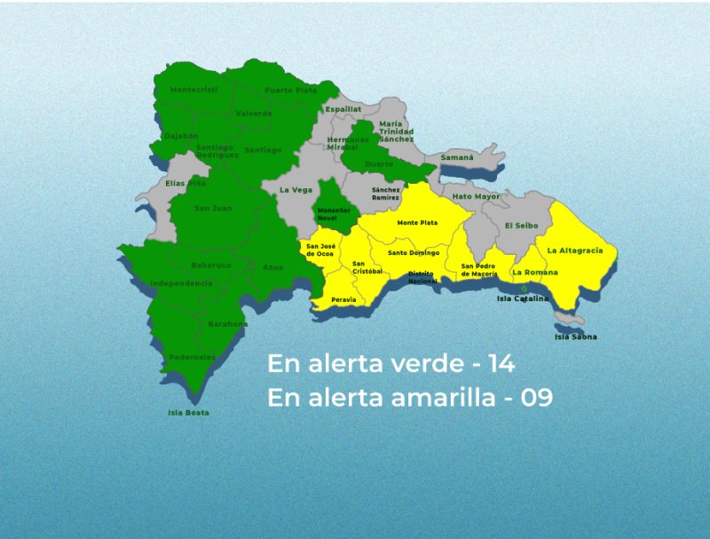 Provincias en alertas amarillas: Monte Plata, Peravia, La Altagracia, La Romana, Distrito Nacional, San Pedro de Macorís, San Cristóbal, Santo Domingo y San José de Ocoa.