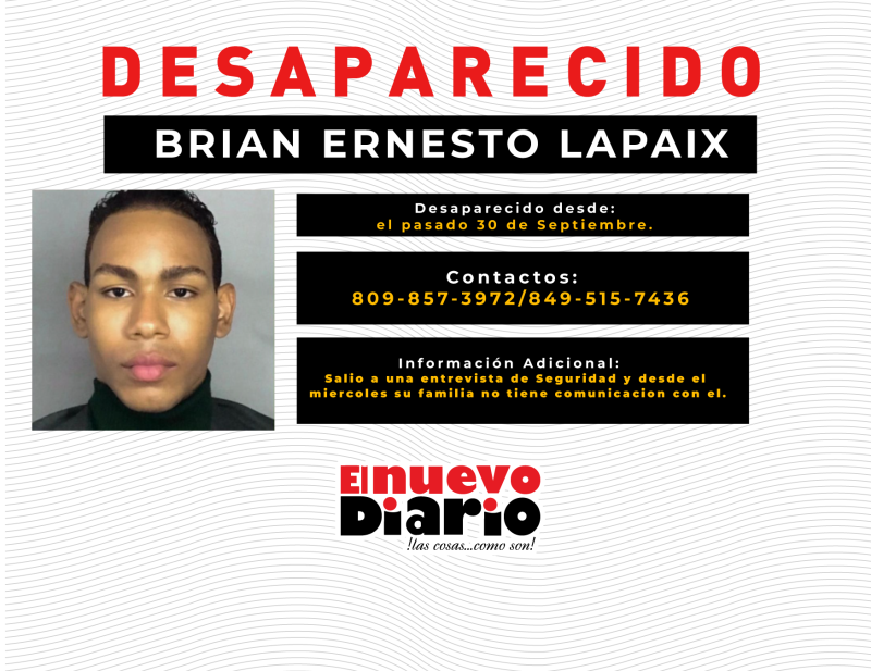 EL NUEVO DIARIO, PUNTA CANA.– Familiares del joven Brian Ernesto Lapaix piden la colaboración de la ciudadanía para dar con su paradero, luego de que desapareciera el pasado martes 30 de septiembre de 2025 cuando salió rumbo a una entrevista con un reclutador privado en la zona de Punta Cana.