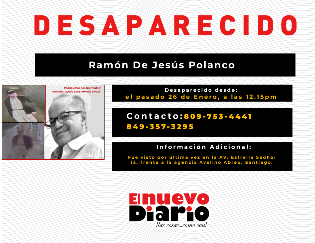 Según el reporte de su familia, Polanco Rodríguez podría estar desorientado y necesitar ayuda para regresar a casa, por lo que hacen un llamado a la comunidad para que cualquier persona que lo haya visto o tenga información sobre su ubicación se comunique de inmediato a los números 809-753-4441 o 849-357-3295.