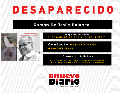 EL NUEVO DIARIO, SANTIAGO.-Familiares y amigos de Ramón de Jesús Polanco Rodríguez piden ayuda para dar con su paradero tras su desaparición el pasado domingo 26 de enero, alrededor de las 12:15 p.m., en la avenida Estrella Sadhalá, frente a la agencia Avelino Abreu, en Santiago.
