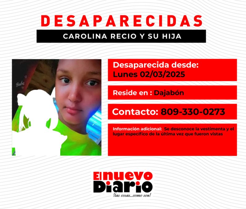 Para cualquier información sobre el paradero de Carolina y de su descendiente se ofreció el número de teléfono: 809-330-0273 con Johanna Martínez.