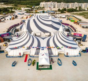 El “Big Top” de 20 metros de alto y un diámetro de 51 metros, se levantó en unas semanas en un terreno de más de 17,000 metros cuadrados en el centro de Punta Cana con ayuda de 70 personas, locales y extranjeros que empujaron a la vez los más de 100 postes que la sujetan.