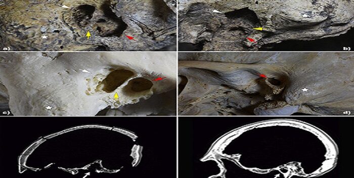 La calavera presenta dos perforaciones bilaterales compatibles con sendas mastoidectomías, una cirugía consistente en la extirpación de las celdillas de los espacios huecos y llenos de aire situadas en el cráneo por detrás del oído y dentro del hueso mastoideo.