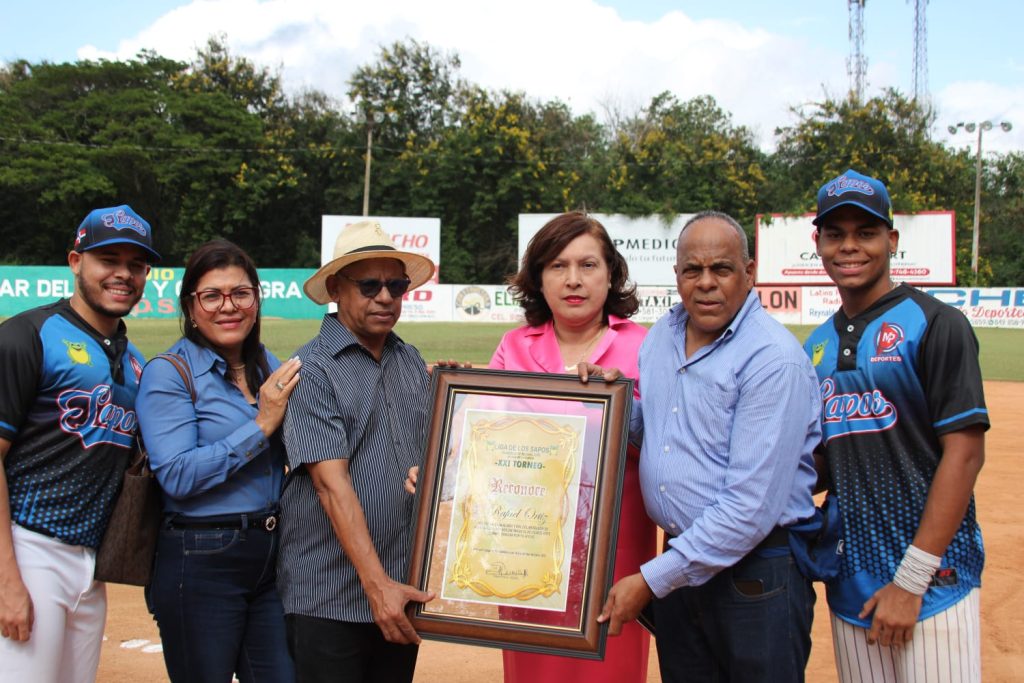 Domingo Ureña y Nakin González entregaron una placa de reconocimiento a Guillermo Collado, primer dirigente de la Liga, luego Américo Cabrera y Angela Jáquez entregaron reconocimiento a Tony Peña R. de Miderec.