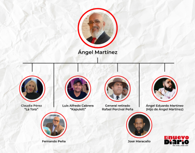 Según los datos a los que El Nuevo Diario ha tenido acceso, en la red estarían involucrados Ángel Eduardo Martínez Estévez, hijo de Ángel Martínez, la comunicadora Claudia Pérez (“La Tora”) y el general retirado Rafael Percival Peña, quien era padre del difunto exteniente John Percival Matos, muerto por la Policía en el 2016 tras ser acusado de múltiples delitos, incluyendo el asalto a la sucursal de una entidad bancaria.