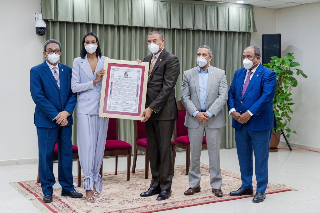 Con una gran sonrisa en su rostro, llena de humildad y gran entusiasmo la modelo, oriunda de Copey (Montecristi), recibió de las manos de los congresistas el pergamino durante un acto celebrado en el Congreso Nacional.