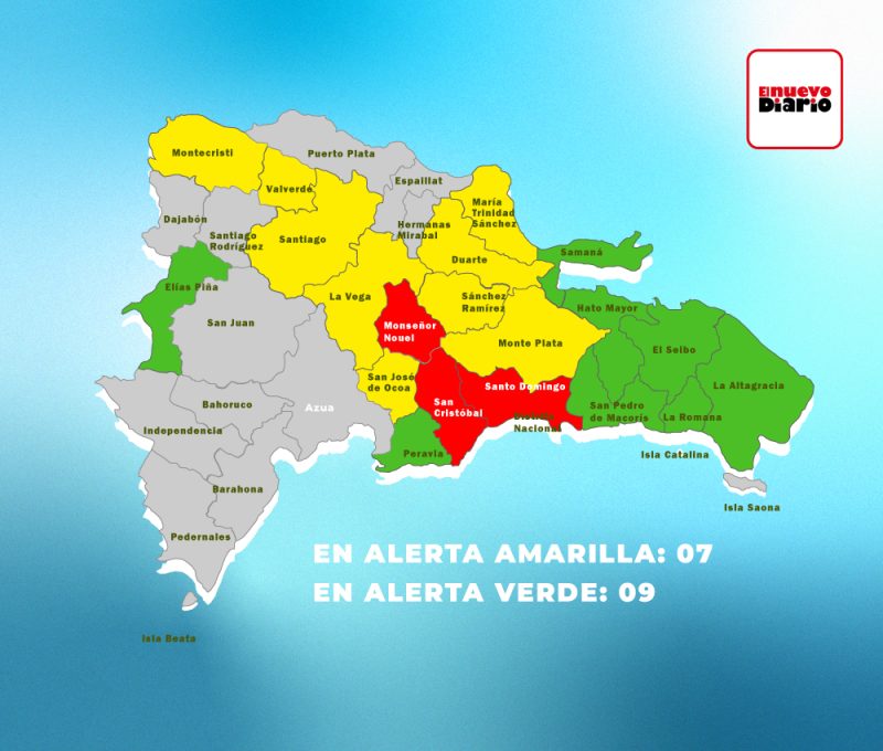 En alerta roja se encuentran las provincias de Santo Domingo, San Cristóbal, Monseñor Nouel y el Distrito Nacional, mientras que en amarilla están Monte Plata, Sánchez Ramírez, Duarte (en especial el Bajo Yuna), María Trinidad Sánchez, San José de Ocoa, Hato Mayor, Montecristi, Valverde, La Vega y Santiago.