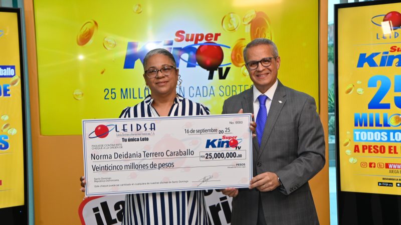 EL NUEVO DIARIO, SANTO DOMINGO.- La Lotería Electrónica Internacional Dominicana, S.A. (Leidsa), entregó este martes a una mujer, residente en Estados Unidos, un cheque de 25 millones de pesos, al resultar ganadora con el Súper Kino Tv, en el sorteo del pasado miércoles 27 de agosto.
