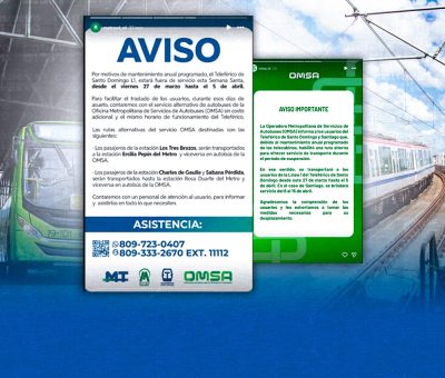 En el caso de Santiago, la OMSA informó que el servicio alternativo estará disponible del 6 al 15 de abril, como parte del mantenimiento programado de las telecabinas.