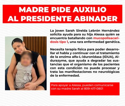 EL NUEVO DIARIO, SANTIAGO.- Un mujer identificada como Sarah Sirelda Lebrón Hernández solicitó este jueves ayuda al presidente de la República, Luis Abinader, para su hija Alessa, quien fue diagnosticada en noviembre de 2024 con mucopolisacaridosis tipo 1 (MPS I), una enfermedad genética rara que provoca la acumulación de azúcares complejos en las células, dañando múltiples órganos y tejidos.