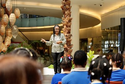 Ante un público compuesto en su mayoría por estudiantes del nivel básico, la expositora explicó que cuando llueve, las copas de los árboles sirven para recolectar agua que se desliza entre las hojas, las ramas y el tronco, humedeciendo el suelo para protegerlo contra la erosión y a la vez para nutrir toda la vegetación.