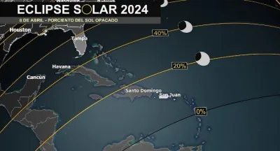 Apunta que Puerto Plata, ubicada en la parte norte de la República Dominicana, tendrá un 14% de apreciación del eclipse solar exactamente a las 3:12 de la tarde, mientras que San Juan, Puerto Rico, tiene 6.6% lo verá a las 3:18 y La Habana, Cuba con 42% lo podrá apreciar a las 2:53.