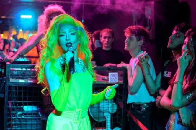 De un bar a otro, su noche empieza con una sesión como DJ, antes de una actuación como drag queen.