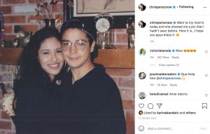 La imagen muestra a Chris vistiendo una camiseta negra, gorra y lentes, Selena luce un atuendo en tono oscuro, melena suelta y aretes plateados.