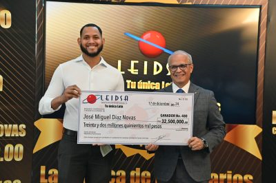 EL NUEVO DIARIO, SANTO DOMINGO.- La Lotería Electrónica Internacional Dominicana (Leidsa) informó este martes, que el joven José Miguel Díaz Novas, recibió el cheque de 32.5 millones de pesos, proporción que le corresponde, por ser uno de los dos ganadores de los 65 millones de pesos que tenía acumulado el sorteo Loto del pasado sábado 23 de noviembre.