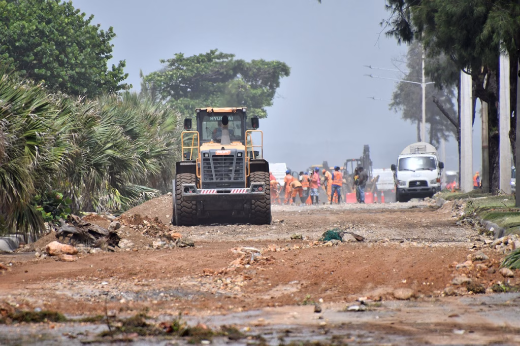 Las brigadas del MOPC laboran con palas mecánicas, retroexcavadoras, camiones tipo volteo, y volquetas, para recoger los escombros arrojados en esa importante vía por los fuertes oleajes provocados por el huracán Beryl en su trayectoria por el mar Caribe.