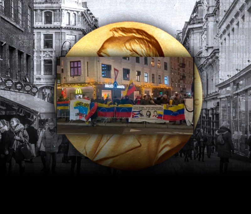 Bajo los lemas «Ningún premio de la paz para los belicistas» y «Estados Unidos, fuera de América Latina», los manifestantes se concentraron delante de la sede del Instituto Nobel de Oslo.