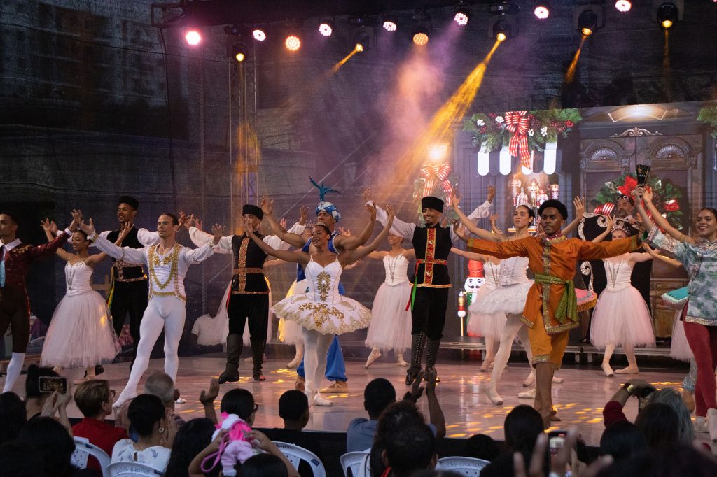 La Dirección General de Bellas Artes (DGBA) entregó un programa exquisito, desde que se dio apertura a las 4:30 de la tarde, en el escenario que se levantó en los jardines de la institución. La primera entrega fue un hermoso regalo para los sentidos, con las interpretaciones navideñas del Coro Nacional y la «Suite del Ballet Cascanueces», un viaje encantador a través de la mágica historia de esta época, a cargo del Ballet Nacional Dominicano.