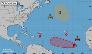 Peter es una tormenta desorganizada cuyos vientos máximos alcanzan casi 50 millas por hora (85 km/h) con ráfagas más fuertes y que va a experimentar un debilitamiento lento en los próximos días.